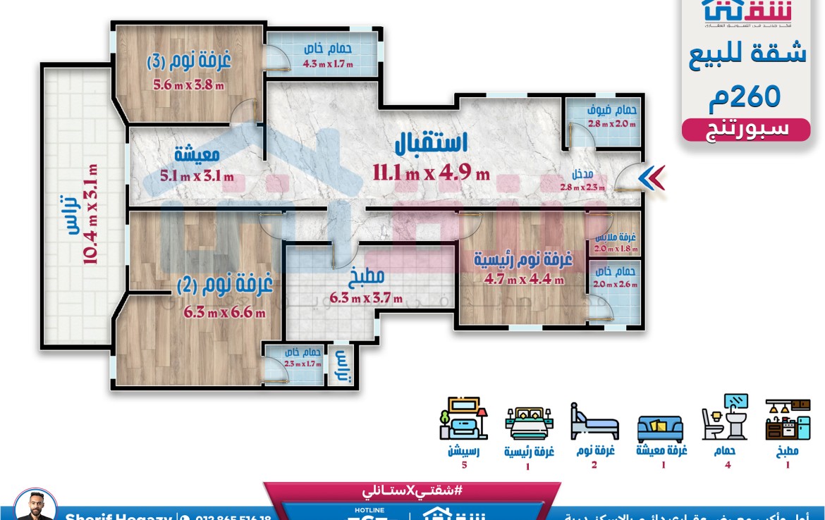 – 3 غرف ماستر + 1 غرفة ملابس (مع إمكانية غلق 2 غرفة) ريسبشن 5 قطع 4 حمام مطبخ