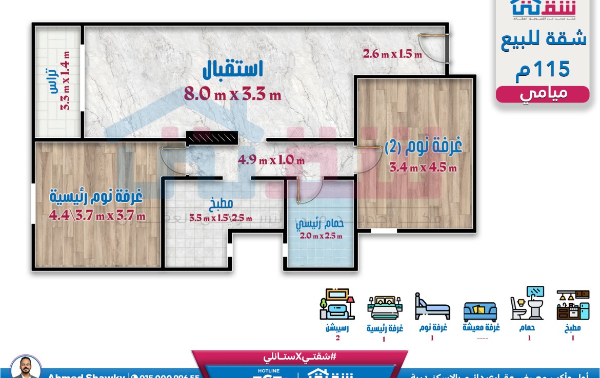 شقة للبيع 115م ميامي (مطلات مفتوحة)