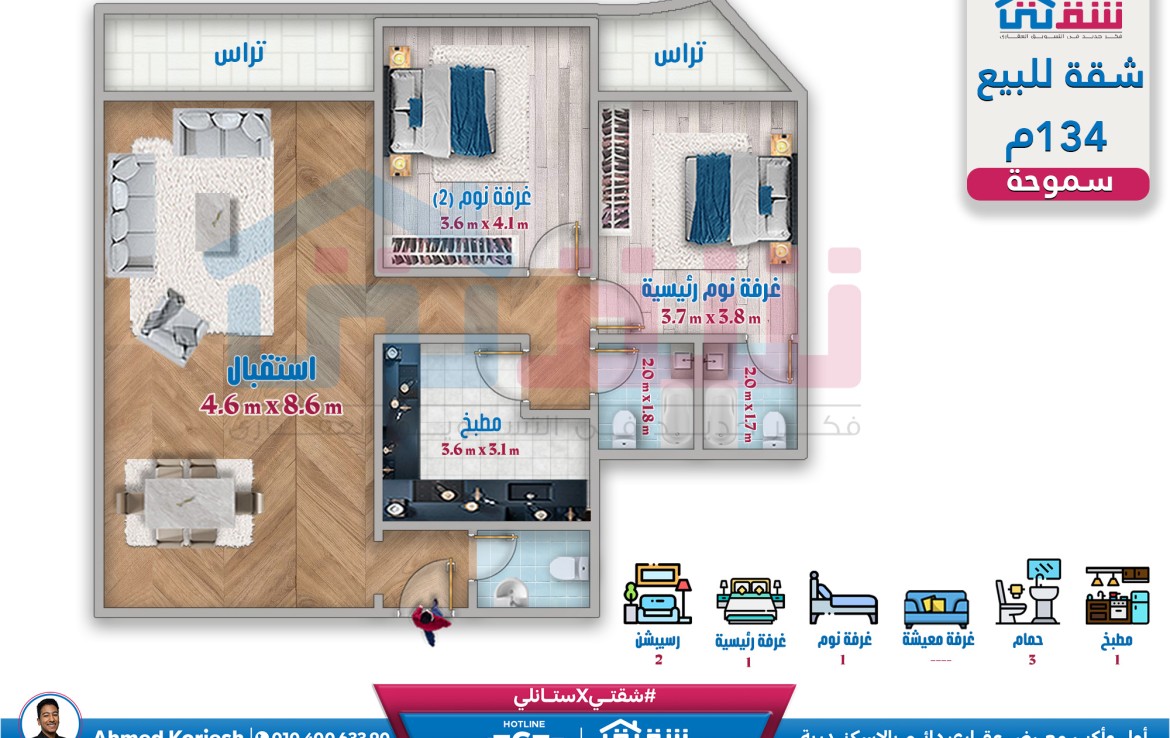 شقة للبيع 134م سموحة – كومباوند The One