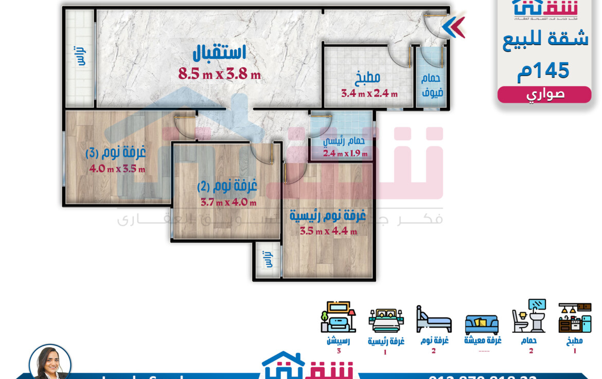 3 غرف (منهم غرفة ماستر) ريسبشن 3 قطع 2 حمام تراس