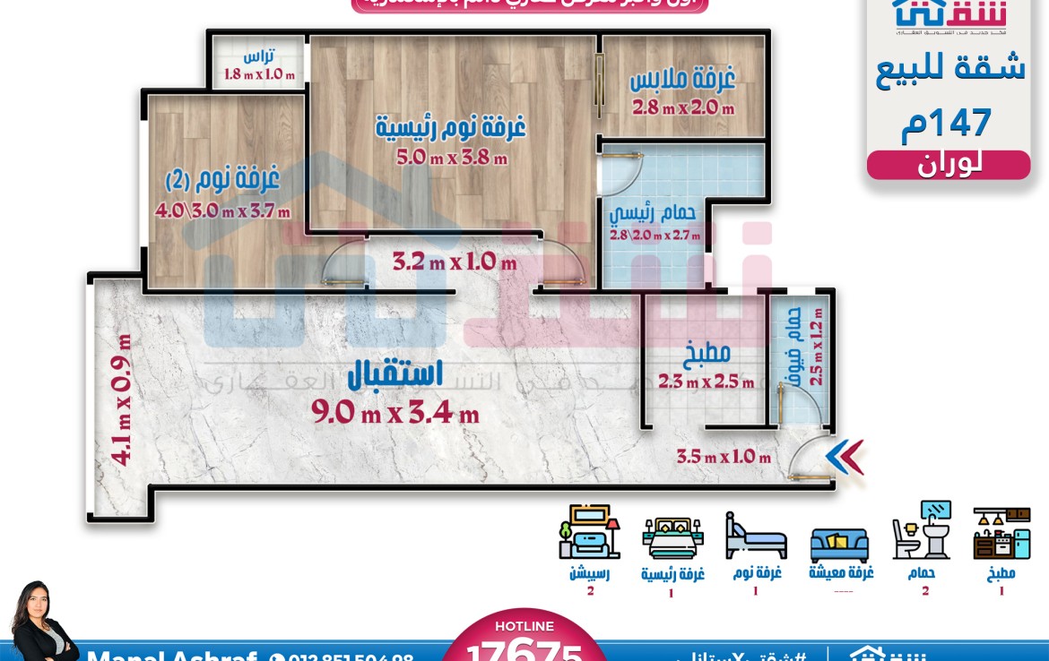 – 2 غرفة (منهم غرفة ماستر+Dressing) ريسبشن 2 قطعة 2 حمام