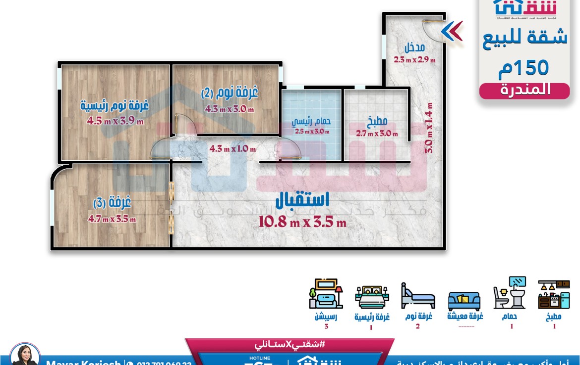 مطلات مفتوحةشقة للبيع 150م المندرة – ش جمال عبدالناصر الرئيسي
