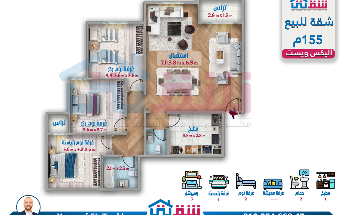 3 غرف (منهم غرفة ماستر) ريسبشن 2 قطعة 2 حمام