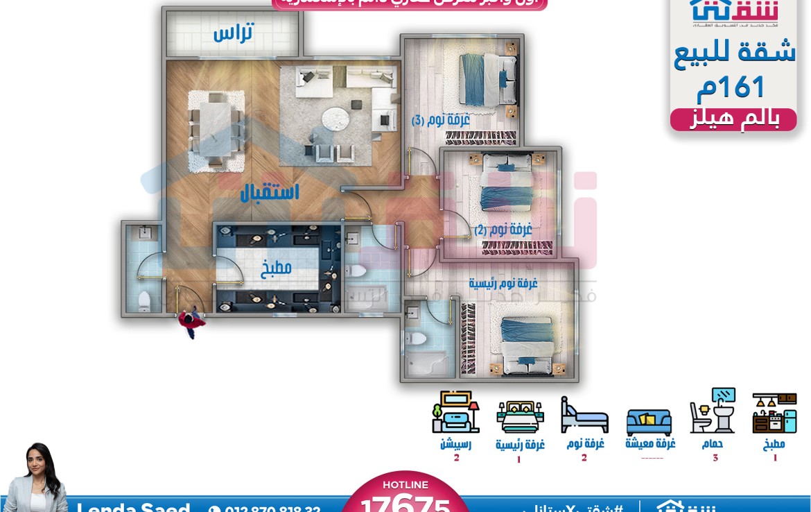 – 3 غرف (منهم غرفة ماستر) ريسبشن 2 قطعة 3 حمام