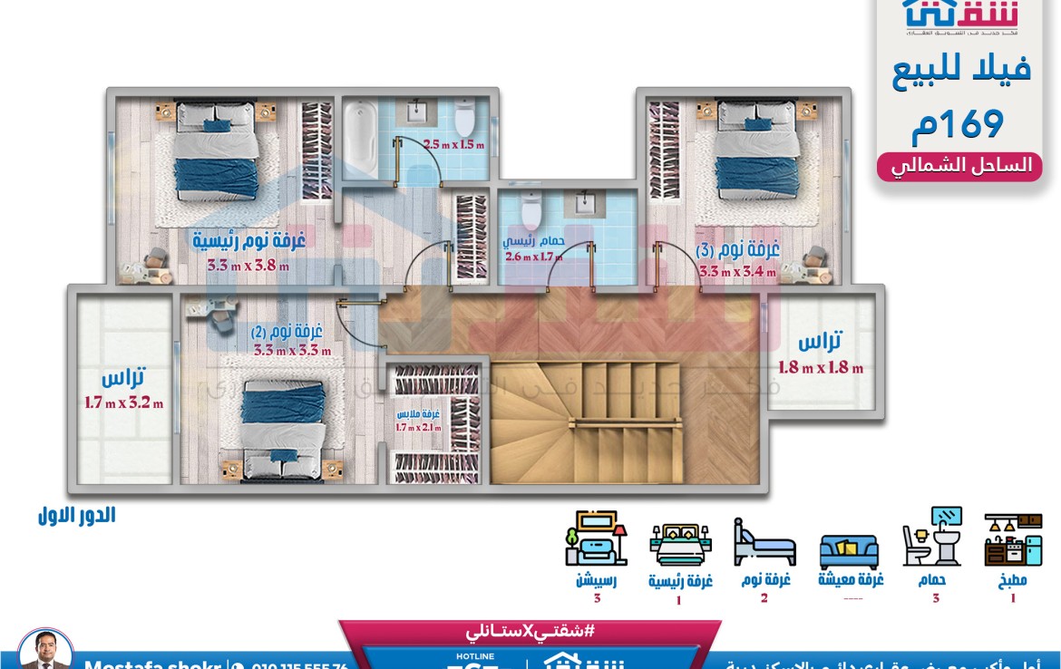 3 غرف (منهم غرفة ماستر+ Dressing) غرفة مربية ماستر ريسبشن 3 قطع 3 حمام