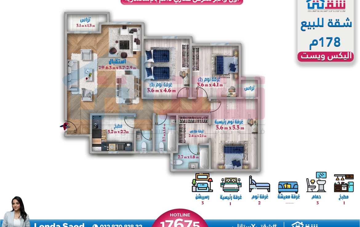 – 3 غرف (منهم غرفة ماستر + غرفة ملابس) ريسبشن 3 قطع 3 حمام تراس