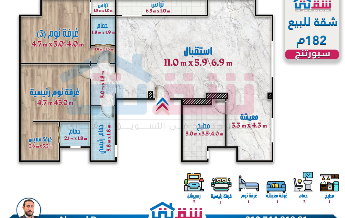 2 غرفة(منهم غرفة ماستر + 2 Dressing room) غرفة معيشة ريسبشن 3 قطع 3 حمام