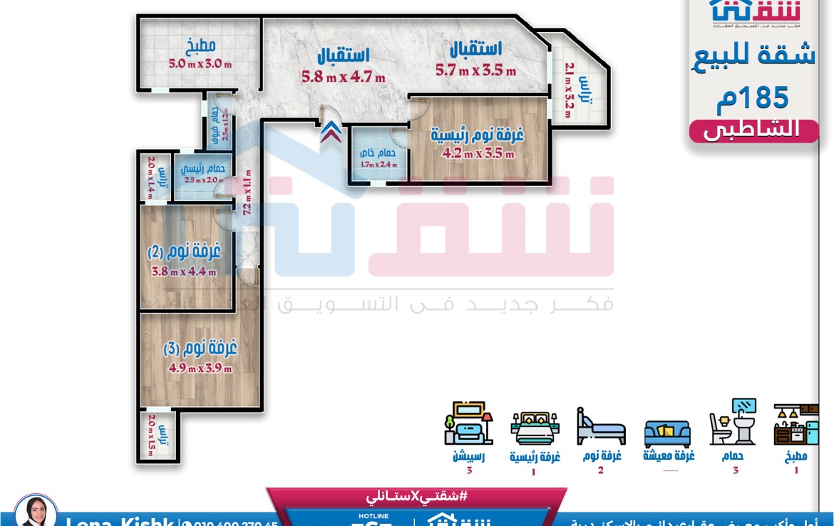 3 غرف (منهم غرفة ماستر) ريسبشن 3 قطع 3 حمام