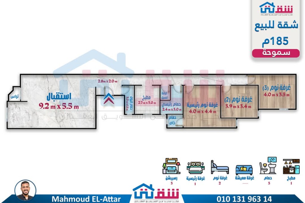 3 غرف (منهم غرفة ماستر) ريسبشن 3 قطع 3 حمام