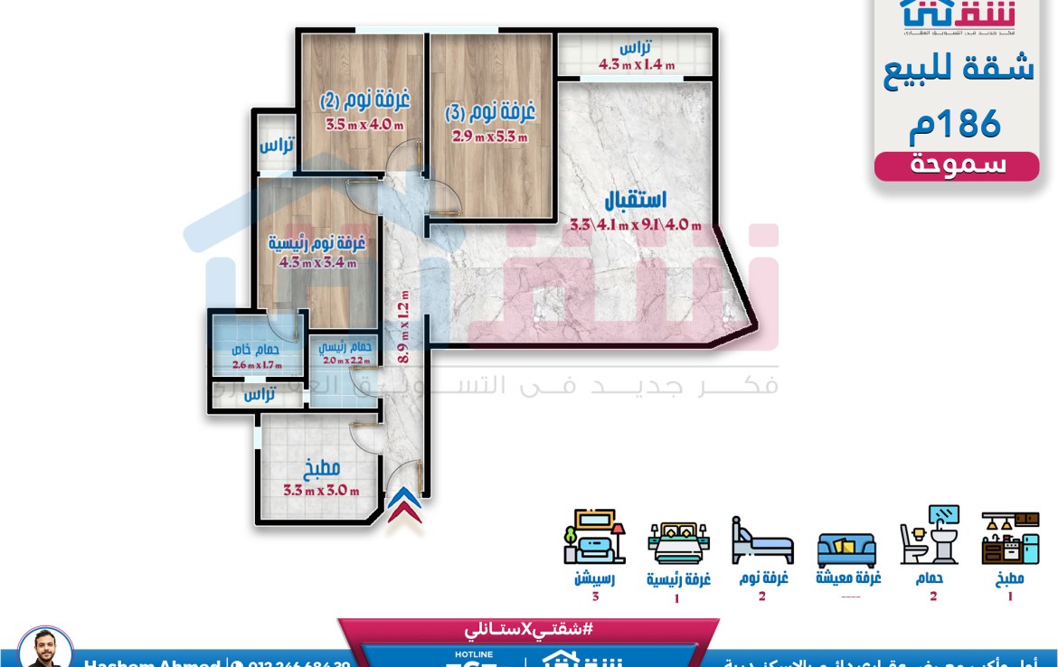 3 غرف (منهم غرفة ماستر) ريسبشن 3 قطع 2 حمام