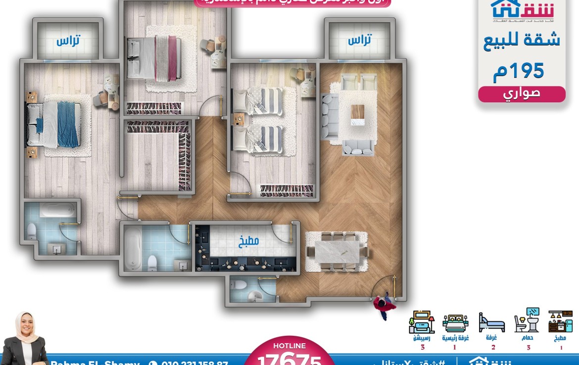 شقة ريسيل للبيع 195م كومباوند صوارى(فيو لاند سكيب) (إستلام 2025)