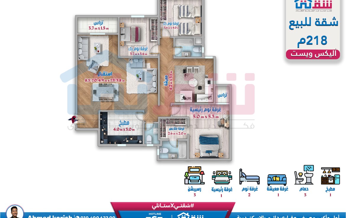 3 غرف (منهم غرفة ماستر+ Dressing) غرفة معيشة ريسبشن 3 قطع 3 حمام مطبخ 2 تراس
