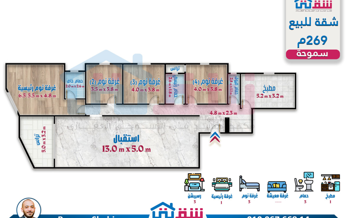 4 غرف (منهم غرفة ماستر) ريسبشن 3 قطع 3 حمام مطبخ