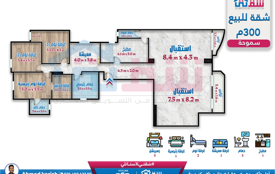 3 غرف (منهم غرفة ماستر+Dressing) غرفة معيشة ريسبشن 5 قطع 3 حمام مطبخ