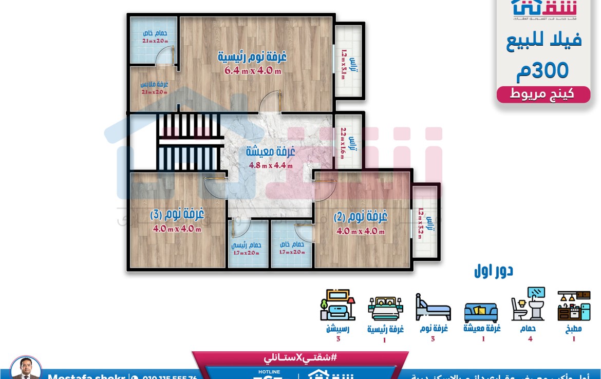 4 غرف (منهم 3 غرف ماستر) ريسبشن 3 قطع 4 حمام