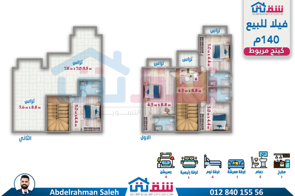 5 غرف(منهم 4 غرف ماستر) غرفة معيشة ريسبشن 4 قطع 5 حمام