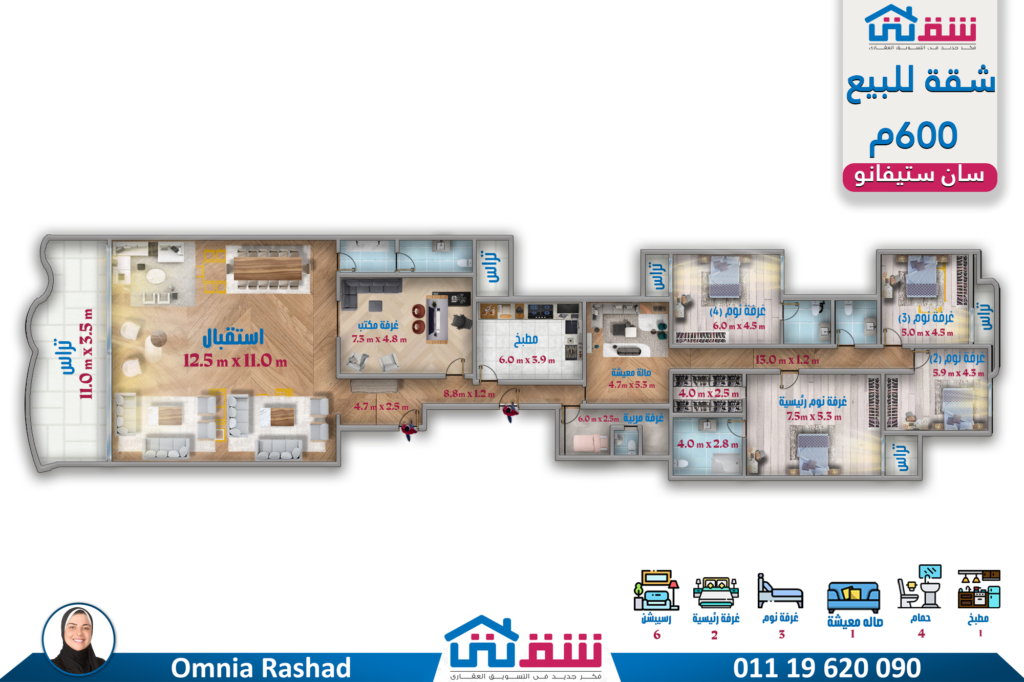 5 غرف (منهم غرفتين ماستر + غرفة ملابس) غرفة معيشة غرفة مربية ماستر غرفة غسيل ريسبشن 6 قطع 4 حمام مطبخ