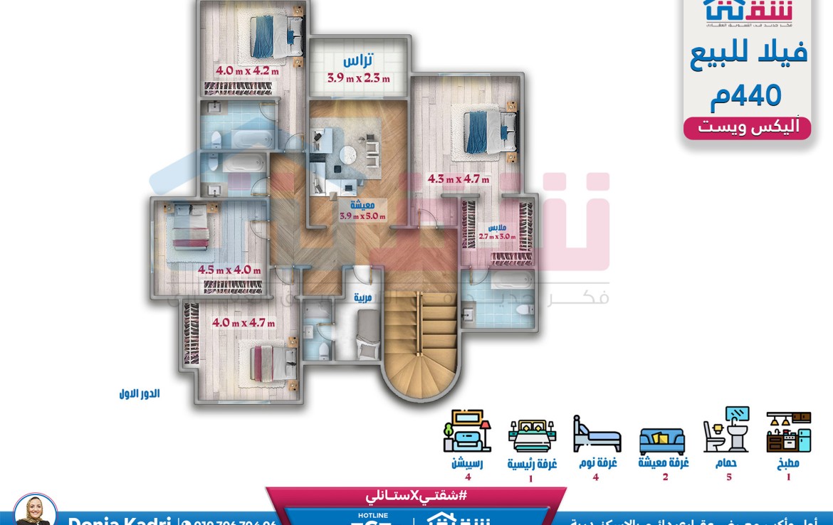 – الدور الأول: 5 غرف (منهم غرفة ماستر + غرفة ملابس) غرفة معيشة غرفة نانى ماستر 5 حمام