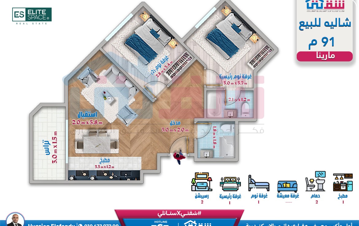 – 2 غرف (منهم غرفة ماستر) ريسبشن 2 حمام مطبخ تراس كبير